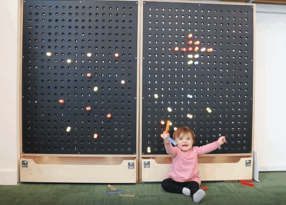 The individual units use LED lights and small fans to keep the interior cooled, and the exhibit requires 110VAC. Each unit is provided with 100 pegs of assorted colors. Options include size variations or adding a storage lockbox base. This component can be made as a free-standing unit or as a table-top version.
