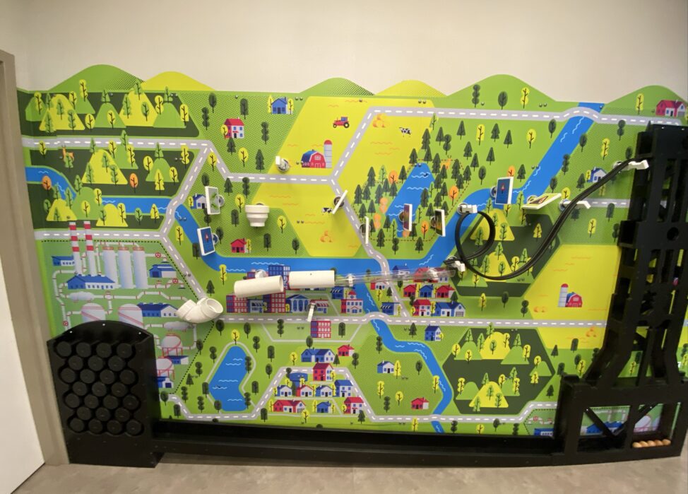 Children’s Museum of Pittsburgh partnered with EQT to design an interactive wall about planning a pipeline route to bring natural gas from a drill site to a processing plant. The wall has magnetic panels designed to hold various ramps and tubes to be used to direct balls from one side to the other, while the map is designed to highlight real world obstacles one may encounter while laying a natural gas pipeline (cities, mountains, protected wildlife areas).