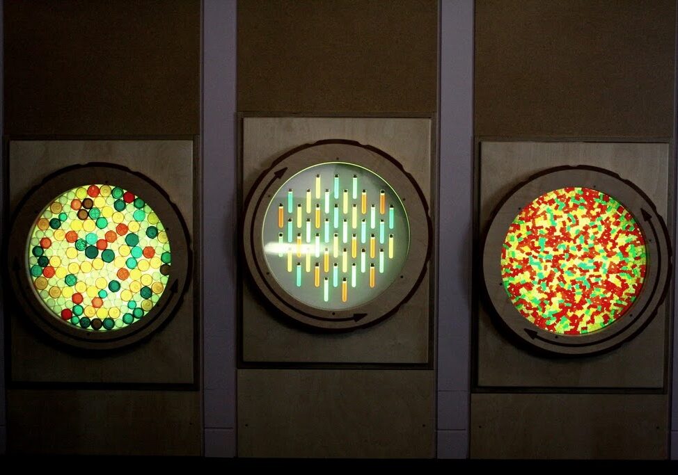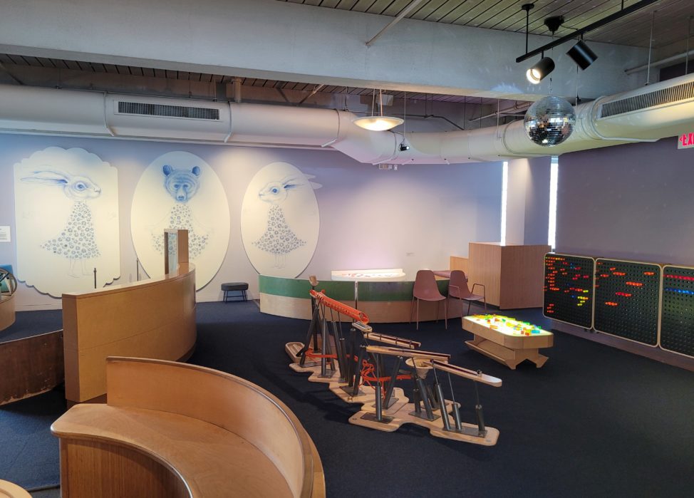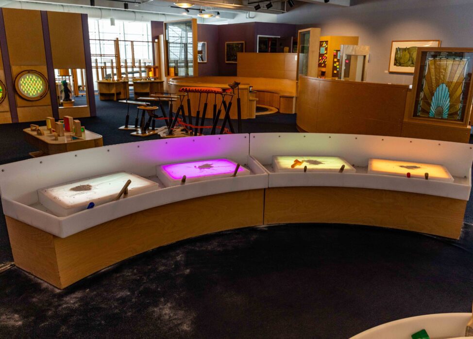 The Nursery offers a range of activities for our youngest visitors to explore their senses, motor skills and understanding of the world. You can ride a seesaw where water bubbles to arise in the center. Touch and comb colored sand atop light tables. Insert colored pegs into a light wall to learn colors and make patterns. Or send balls through a nine-foot twisting, sculptural maze.