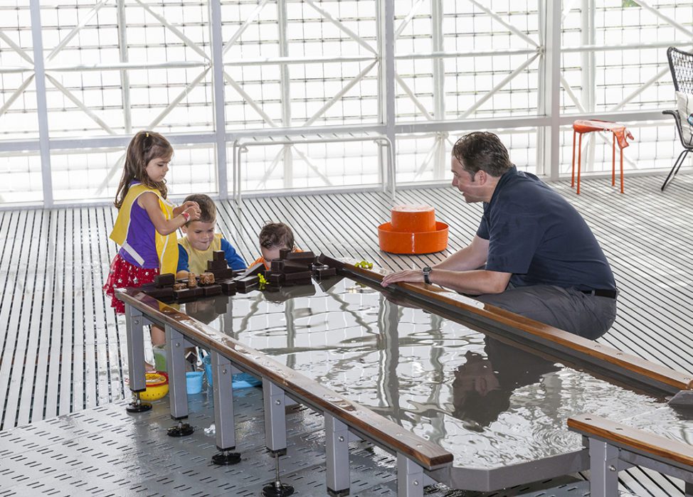 Waterplay is one of the permanent exhibits of the Children’s Museum, created in 2004 and renovated in 2012 and 2017. This perennially favorite space encourages experiencing water through many features and in many states. You can build a fountain, dam a stream, turn a waterwheel, have fun with a whirlpool, play at an ice table and wander through a rain shower. And let’s face it, filling and dumping out a bucket of water never grows old.